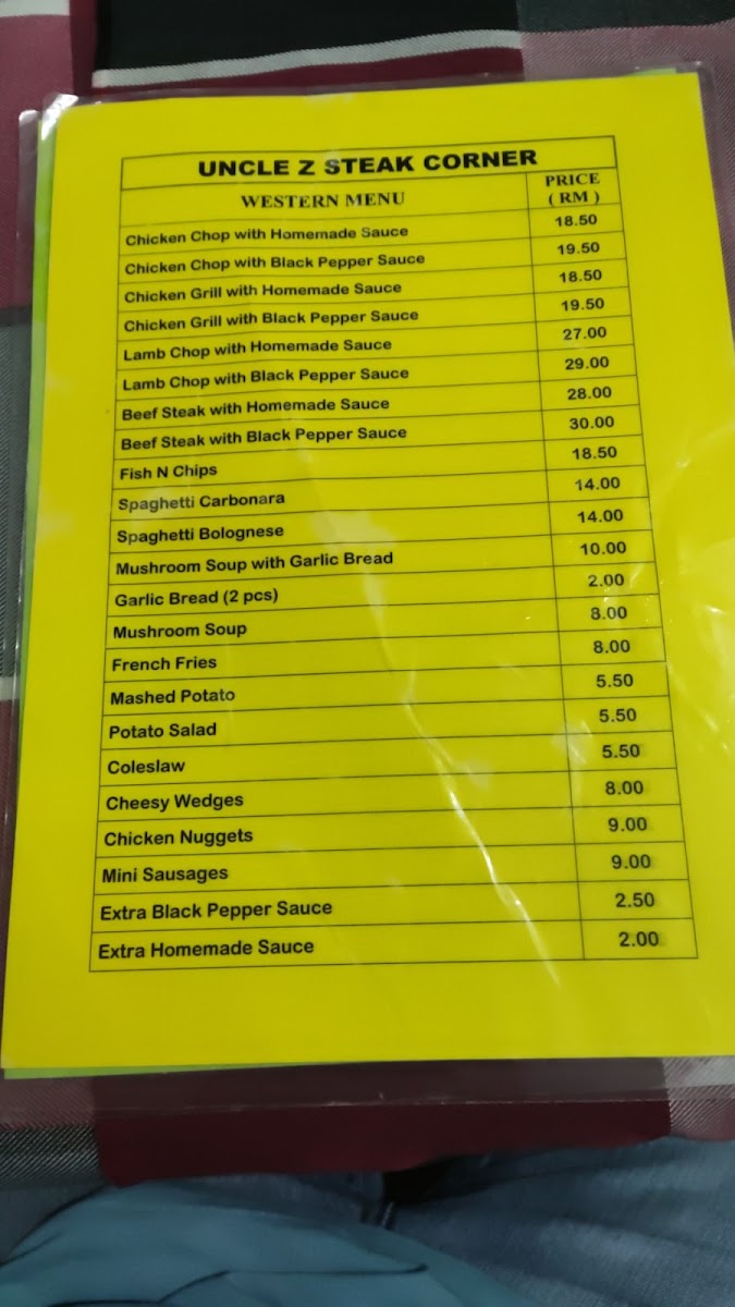 Welcome to Uncle Z Steak Corner, a hidden gem located in the heart of Seremban 2, Negeri Sembilan. This eatery is celebrated not just for its affordability but also for the unmistakable quality of its food. Diners rave about the tender beef steak and lamb chop, both cooked to perfection and packed with flavor. Customers particularly enjoy the crispy chicken chop, which complements their well-loved nasi lemak—rich in coconut milk and paired with a smoky, spicy sambal.
